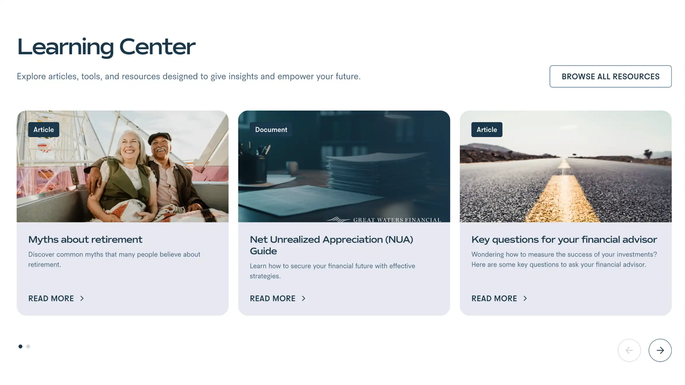 Advisory services are intangible by nature – hard to browse, harder to compare. We borrowed from ecommerce patterns to make Great Waters' offerings feel productized and navigable. Interface design turned complex service tiers into something a prospect could scan, understand, and act on without a phone call first.