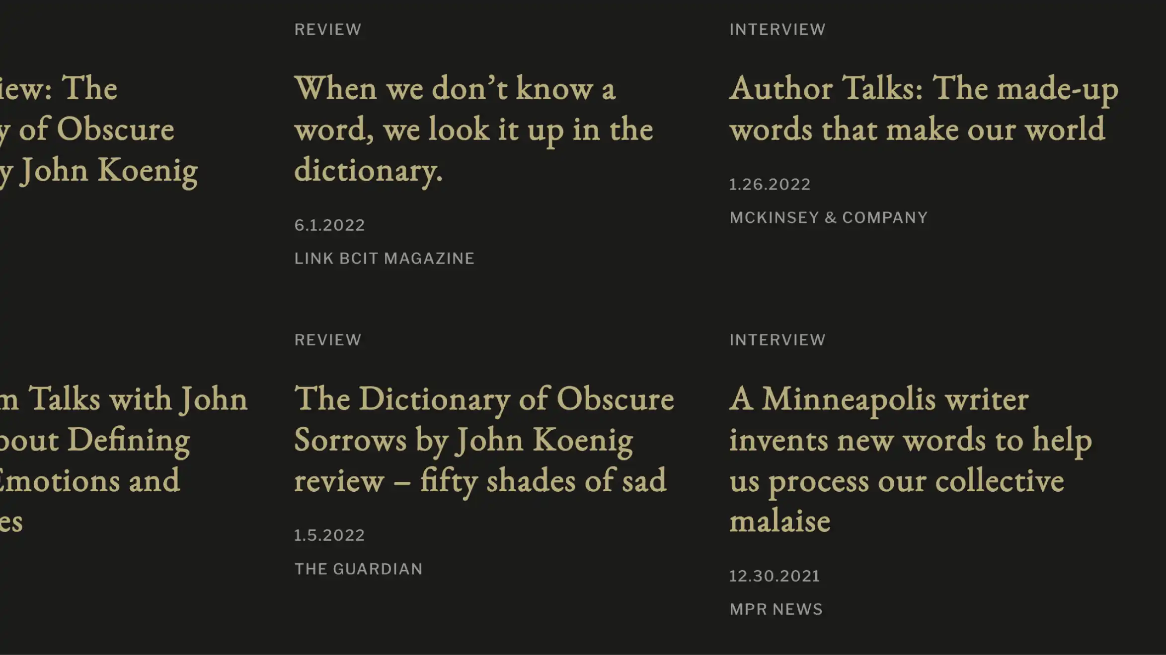 The Dictionary of Obscure Sorrows is a compendium of new words for emotions we all feel but haven't had language for. Qontour built the interactive digital platform – designing the site in Webflow, generating an AI-powered image library, and launching a feature that lets visitors submit their own sorrows and add new definitions to the dictionary.